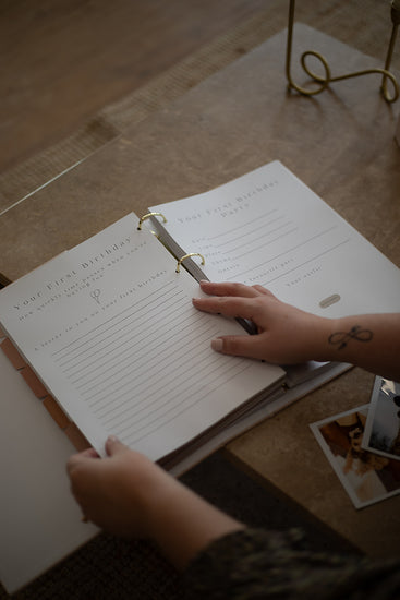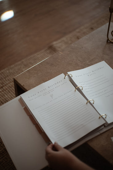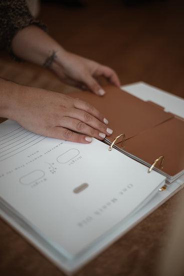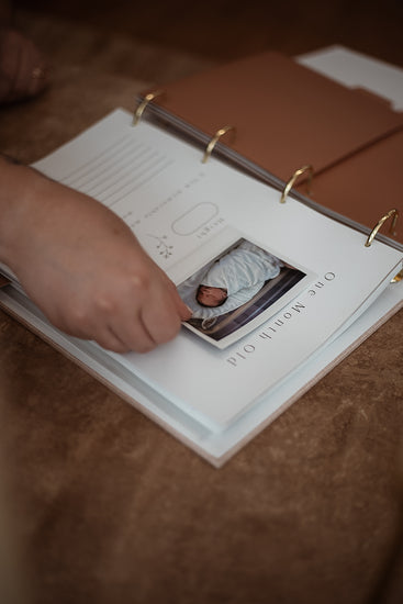 The journal has 6 sections, containing neutral toned dividers with pouches at the back for safekeeping of any materials you wish to tuck away. It also contains a zip pouch at the back of the journal for storing photos, certificates and any other keepsakes you may wish to tuck away.