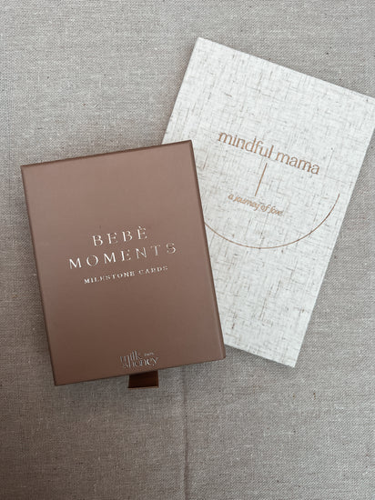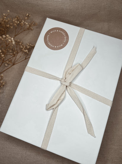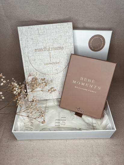 Our mama-to-be gift box is an A5 size and comes with our gorgeous Bebè Moments milestone cards and a Mindful Mama journal. Packaged in a premium white box with tissue paper and wrapped with cotton ribbon and a gift tag.