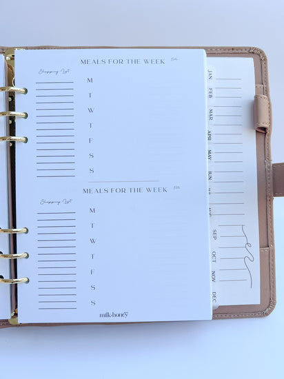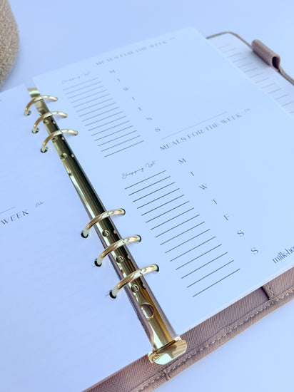 8 double sided pages of meal planners with a section for your corresponding shopping list made from 100gsm white paper.